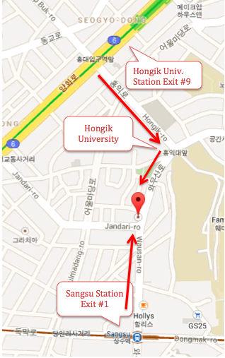 Directions: Take Line 2 to Hongik University Station or line 6 to Sangsu Station. From either stations, walk towards Hongik University. At the intersection facing the Hongik University entrance, go right and walk down the road for approximately 5 minutes and the building will be on your right. (A Café Gurunaru is right beside it)