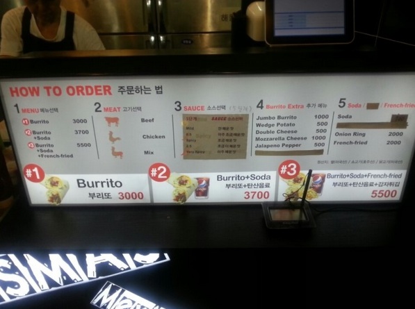 Now, I cannot say that Dos Mas is authentic “Mexican” food. I would describe it more as a Koreanized Mexican restaurant. A solely burrito specialized restaurant, Dos Mas also allows personalization where you can choose what you want for a reasonable price. Just a buritto is 3,000 won, a buritto and drink is less than 4,000 won, and a “set”, with a buritto, drink, and French fries is under 6,000 korean won.