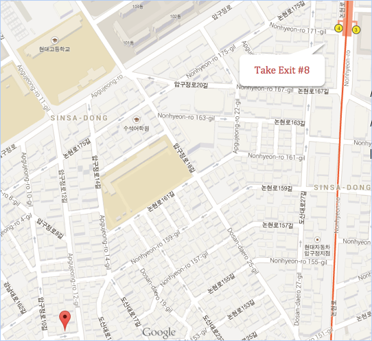 Take Line 3 to Sinsa station and come out of exit 8. Keep walking straight until you see a Tous le Jours, where you will turn left. Walk straight down the road until you spot Coffee Chu, which is located on the second floor.