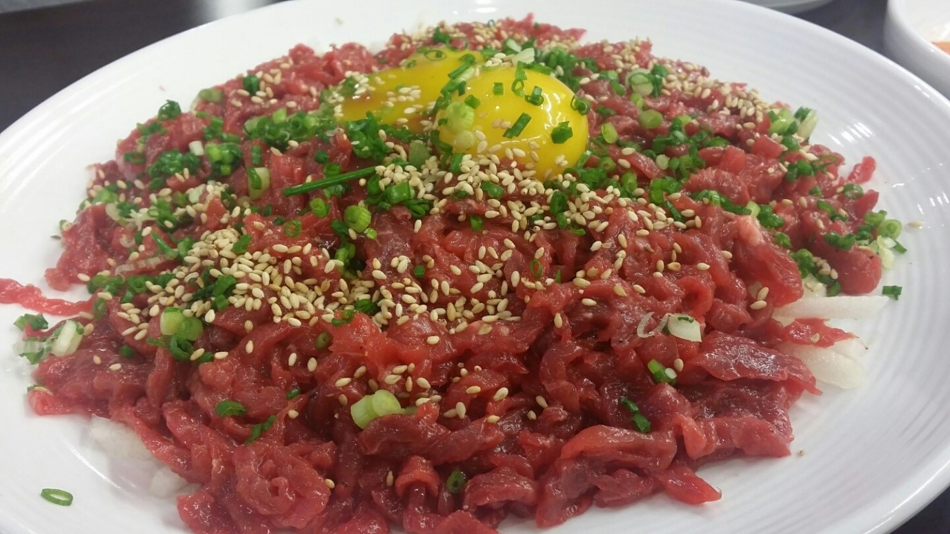 The second one is “Yukhoe (육회)”. Yukhoe is Korean style raw beef. Koreans eat Yukhoe with raw eggs and sesame oil. Gwangjang market is very famous with Yukhoe. It tastes like sashimi but more tough. Last semester, there were friends who came from western countries and went to Gwangjang market to eat Yukhoe. Actually, they were unfamiliar with raw beef, but really enjoyed it in the end! For exchange students to Korea, I think it is worth giving a try at eating since it would be special experience.