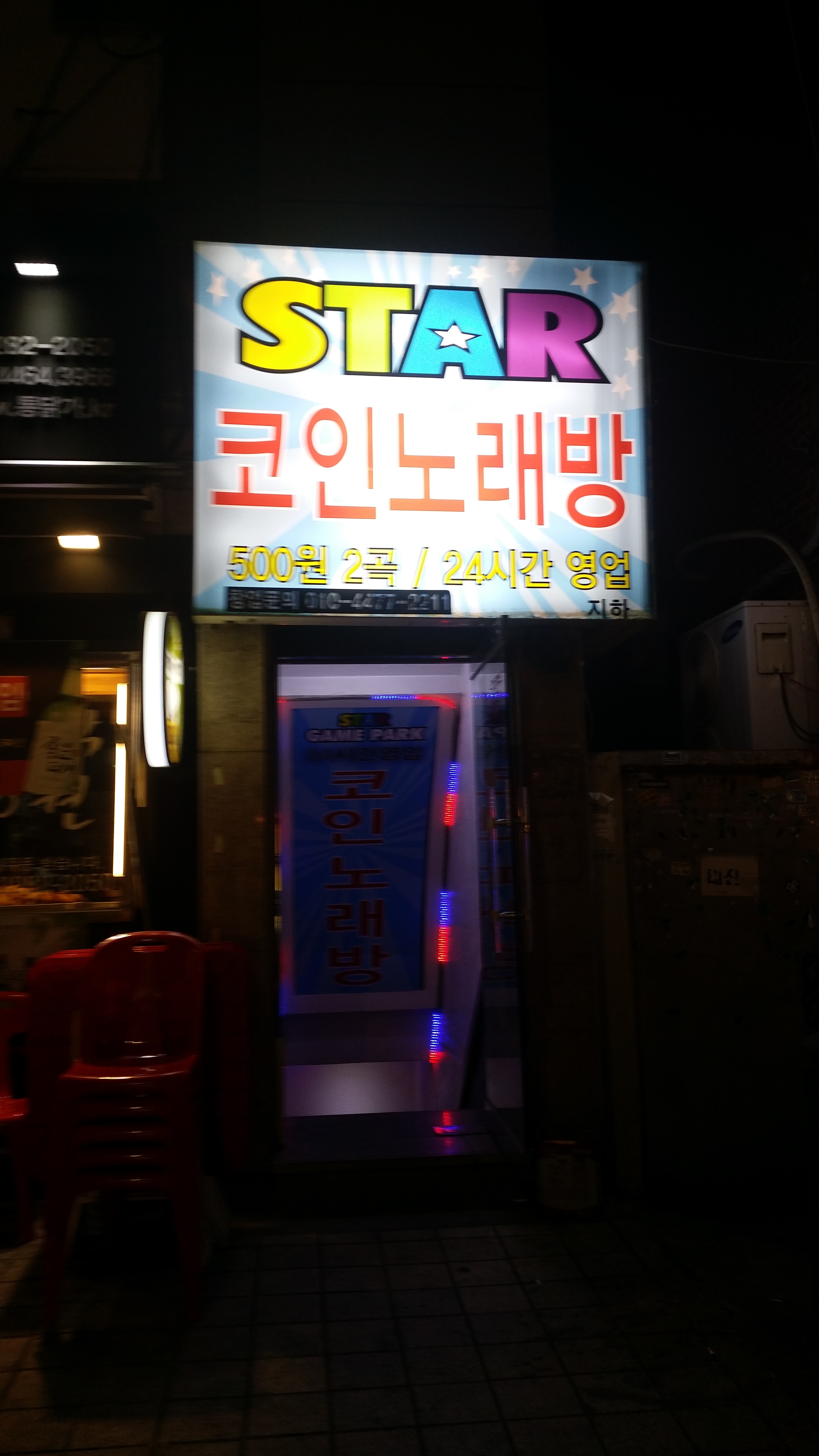 It is cheap enough to sing alone. Price is 500 Won for two songs. And in coin karaoke room you can sing just two songs or even more if you please. You can stop by to sing a few songs. It is so small that maybe just two or three could enter in one box. If you want enter with three friends (if four people enter in a box) I won’t dissuade you. If you want to play with many friends in a large room, I recommend normal karaoke rooms. Coin karaoke room is so popular that many people are waiting in line. I know two coin karaoke room in Wangsimni. Star coin karaoke room has 12 rooms, and Wara coin karaoke room has 14 rooms. The quality of the facilities are almost the same.
