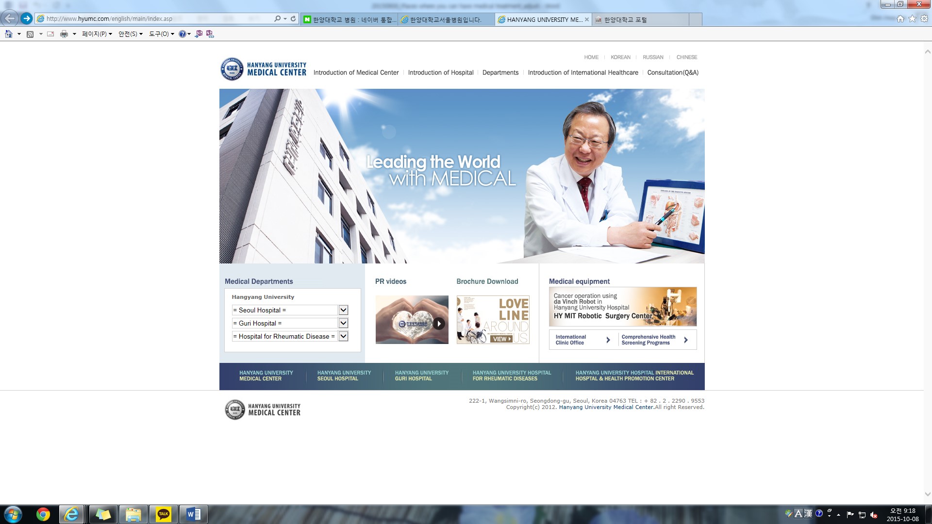Furthermore, Hanyang University Medical Center opens at 9 : 00~17:00. You have to make a reservation first if you want to get treatment. Because it is a big hospital, it has a formal process. You can make a reservation through Internet and phone. The website domain is http://www.hyumc.com/english/main/index.asp