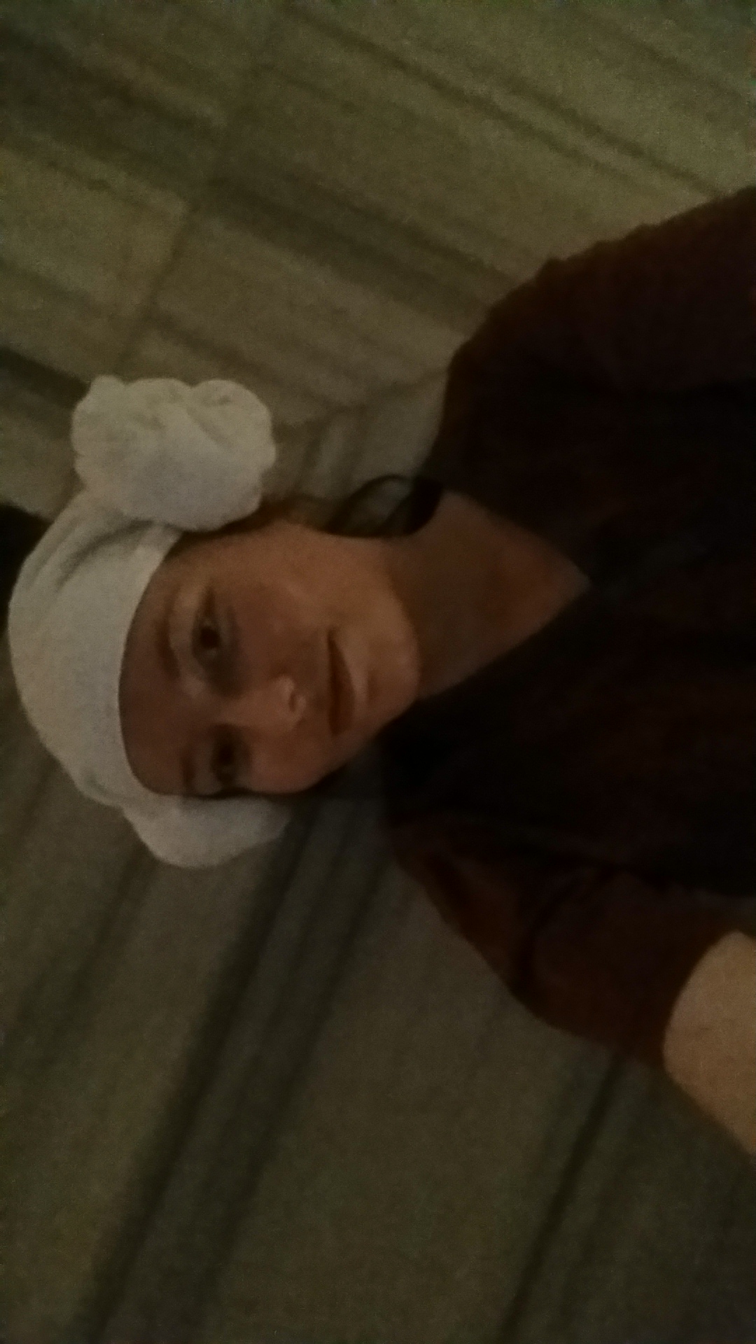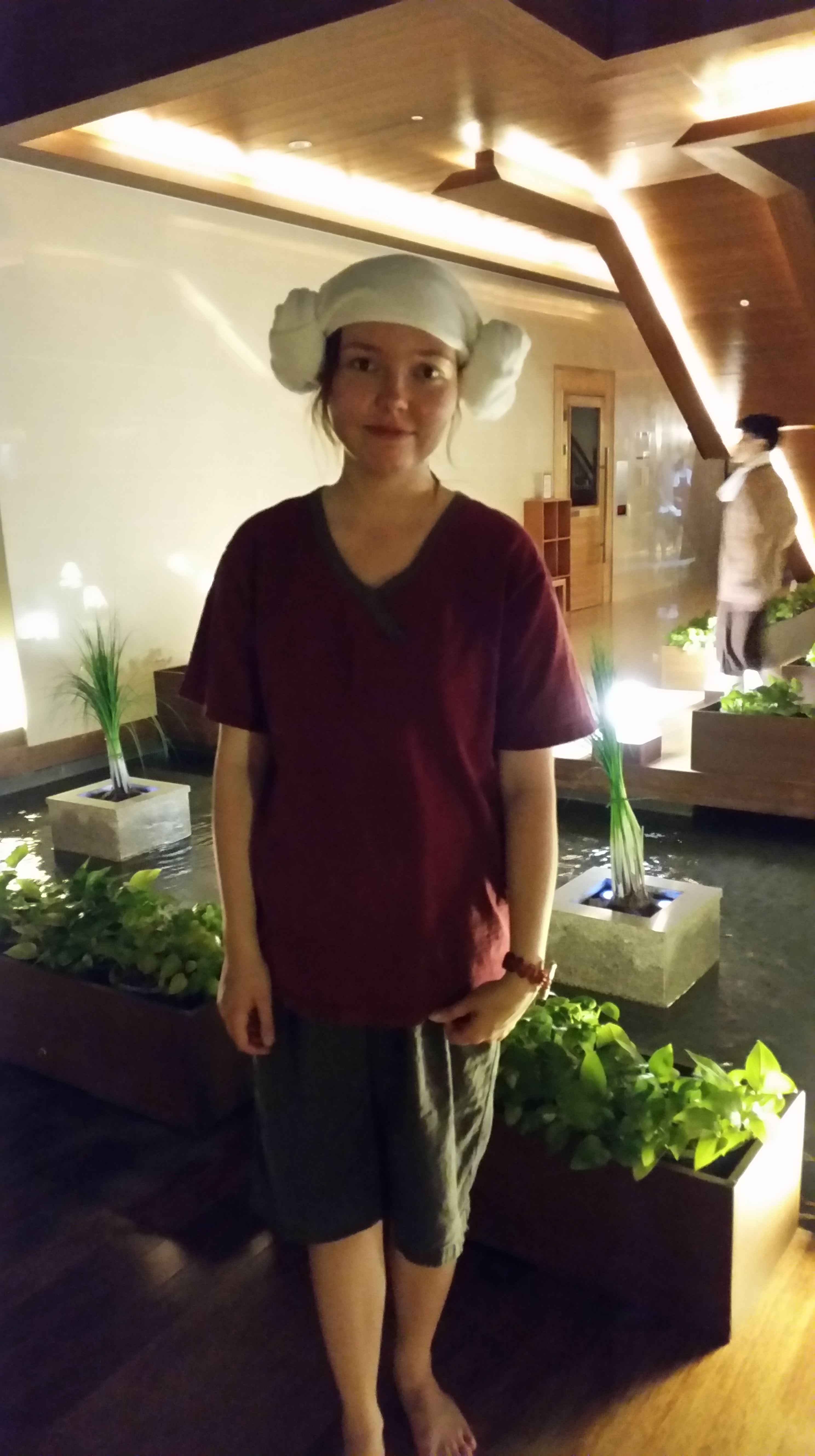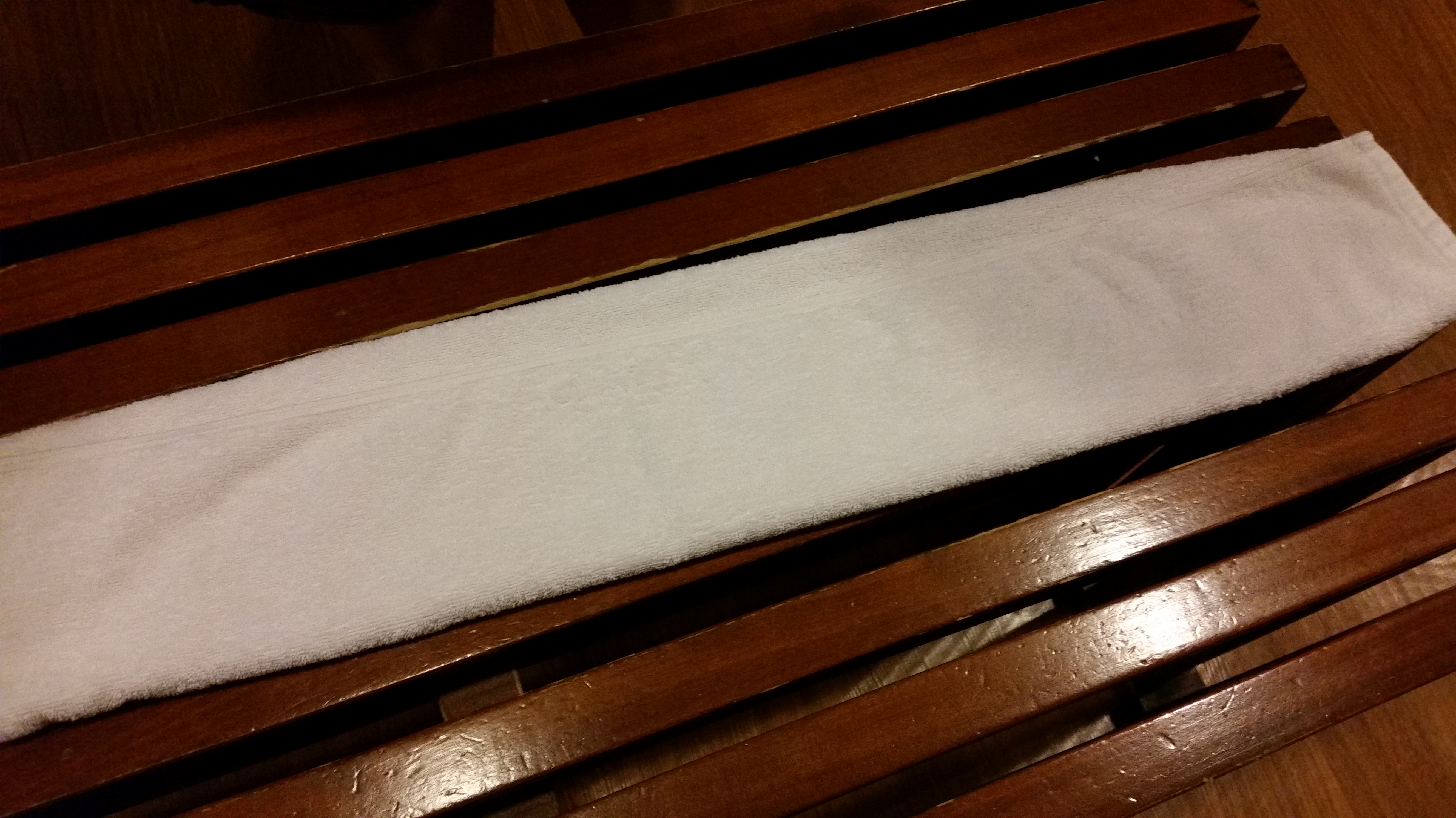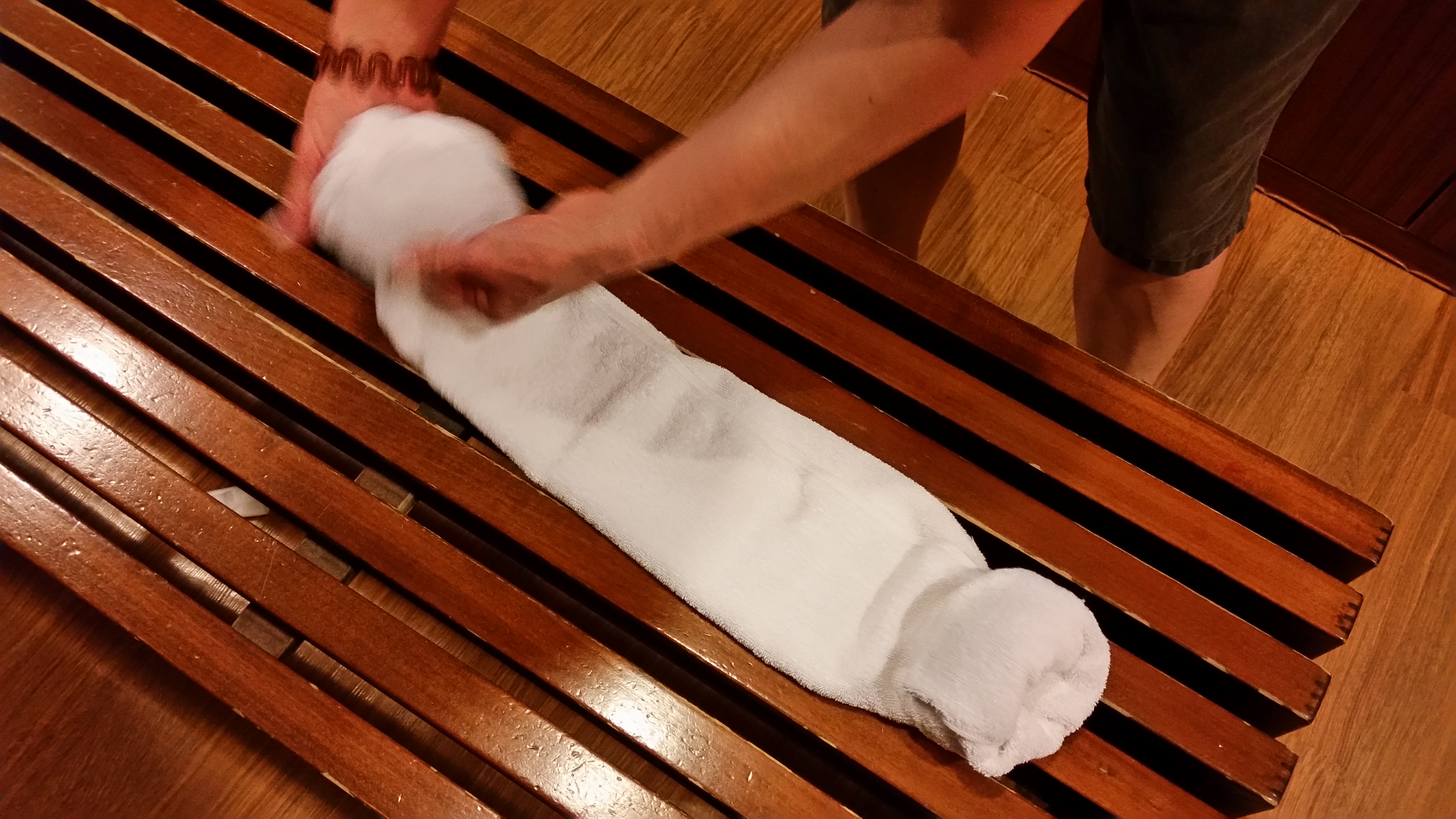 Here is how you can fold your towel (that you received from the desk with your sauna clothes) into a cute jjimjilbang head towel: