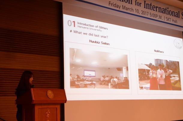 Glitters member Ji-Young Min (민지영) and Hee-Sun Yang (양희선) did a presentation about the overall facilities of HUBS and Hanyang University, also introducing the events Glitters will be holding this semester. Ji-Young started out by briefly reviewing last year’s events of Glitters. Then she introduced the Business school and how to use its facilities such as the lockers, student union, and printer. Next the mic was tossed to Hee-Sun who showed the facilities of Hanyang University such as how to use the library seats, the best cafeterias, and the location of the student gym. Then at part 2 of the orientation, plans for Glitters 2017 Spring Semester was presented. Glitters are planning to have a company visit this April. The company visit by Glitters first started last semester, and was a big success. The international students that participated all said that it was a unique and unforgettable experience. The students who came to the orientation all received a tote bag and some souvenirs. Ildi from Germany said “The orientation was very useful because it showed us information that we didn’t know, and nobody would tell us”.