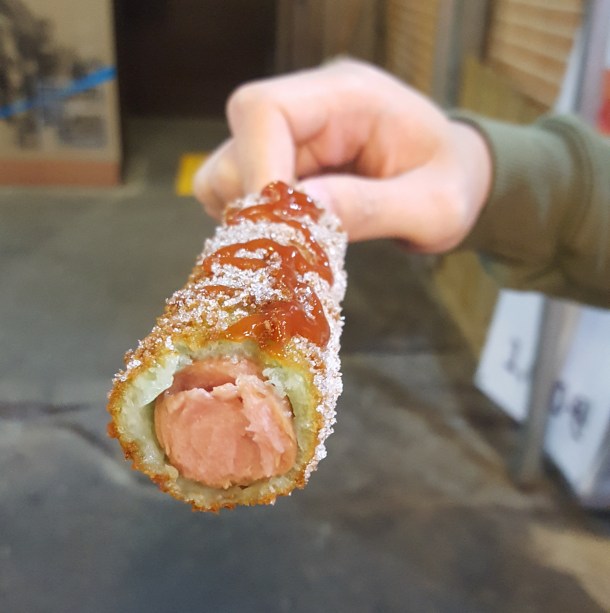 Not very different from hot dogs-on-stick that are sold in North America, but there were a number of toppings I wouldn’t have expected if I were in North America. There were options like having pieces of potato fried and battered over your hotdog, as well as the option of having your hot dog coated in sugar. My friend even opted to have a thin coat of wasabi around their hot dog before being put into the fryer (pictured below). Each choice was between ₩1,000 and ₩1,500.