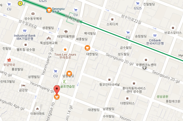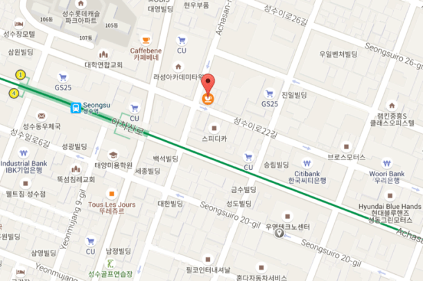 If you are going by subway, get off at Seongsu Station (성수역) exit 3, turn right then first left. Walk down about 250m and it will be on your right.