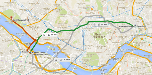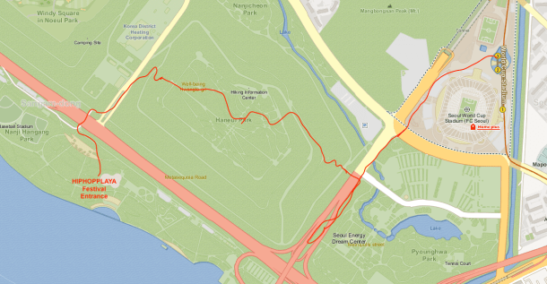 The trek to the venue was a bit rough for me and my friend. We had thought we’d be able to take a short 15 minute walk from World Cup Stadium Station (월드컵공원역) to the park, but instead, had to cross the mini-mountain in Haneul Park (하늘공원) and then cross the highway (thank goodness for the bridge)! Instead, I recommend that anyone planning to go to Nanji Hangang Park, regardless of the occasion, take the transit option mapped out in the second image below. It will save you time, and if the morning was hot and humid like the day of the festival was, it will also save you a very uncomfortable hike.