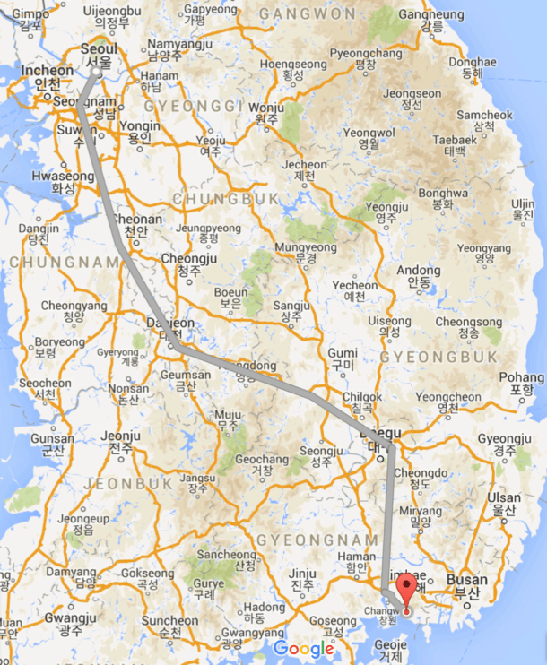 Map of Seoul to Jinhae, Overview (Source: Google Maps)