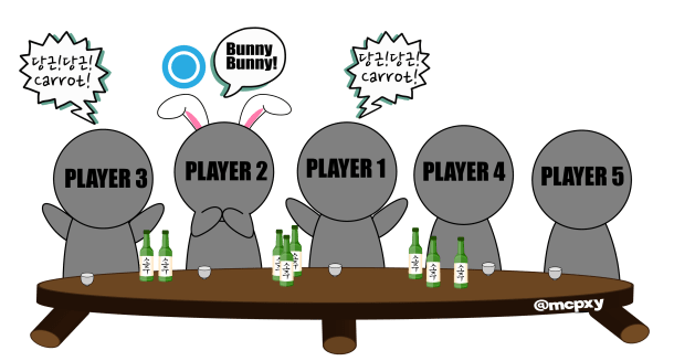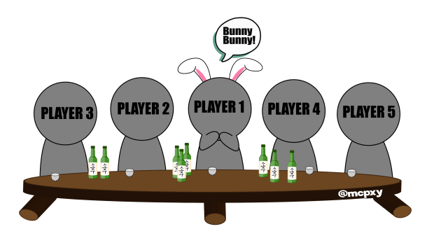 Another simple to play with a large group of people would be Bunny Bunny. This game begins with someone who is “it.” The “it” person begins with two beats of saying “bunny bunny” and can pass being “it” to someone else in the group. The new “it” person has to say “bunny bunny” themselves and pass it along to someone else in the group, and the two people directly beside them have to do a little dance and say “당근” (tang-geun/carrot). In reality, the game moves very fast, so if an “it” person fails to say “bunny bunny,” or if the people beside them don’t say “당근” then the whoever disrupted the flow of the game would have to drink.