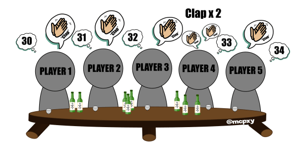 And so on. If anyone says a number they were supposed to clap out, or the order in any way is messed up, the person who disrupts the flow of the game has to drink. Things get a lot more interesting when you reach 30, where every number is clapped, except “33” which is clapped twice.