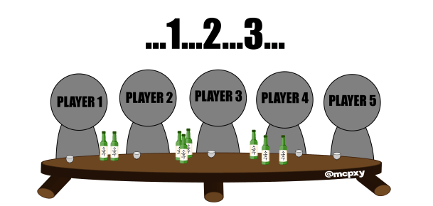 The group chants this three times and then everyone piles their hands one on top of the other, with no particular order. Then, an “it” person” calls out a number, and then, starting from the person whose hand is at the bottom of the pile, each person says a sequential number and moves their hand from the bottom to the top of the pile. Whoever places their hand on top and says the number the “it” person initially called out has to drink.