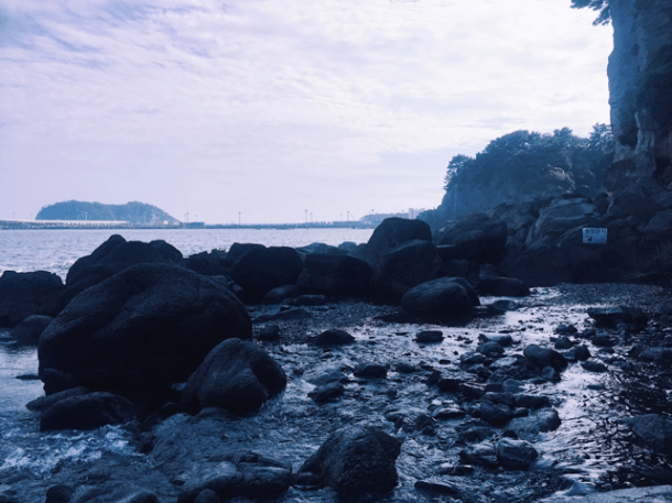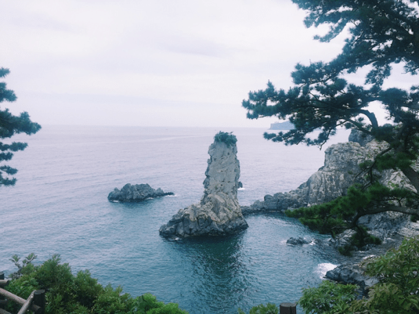After lunch, we headed to Oedolgae Rock (외돌개), an amazing rock surrounded by beautiful islands in Seogwipo. It is known for being the filming location for the popular 2003 Korean drama series Daejanggeum. The Oedolgae Rock also tells the story of a grandmother, who sent out her husband to the sea. She stood facing to the sea every day in hopes of seeing him return, but she turned into stone before they could reunite (represented by the tall rock on the picture below). One day, the husband finds his way back and decides to be with her forever (represented by the smaller rock to the left).