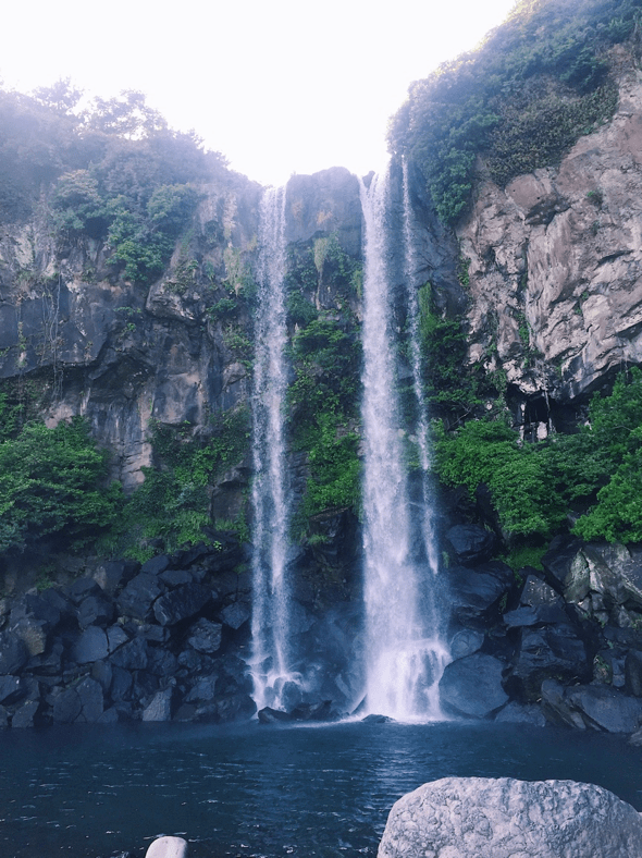 The Jeongbang Falls (정방폭포) is the only waterfall in Asia that falls directly into the ocean water. Before seeing the waterfall, we had to climb about a hundred stairs. If you want to take pictures close to the falls, you also need to climb through many rocks. I also suggest taking a look at the rocky cliffs leading to the falls, where you may spot some women divers in action!