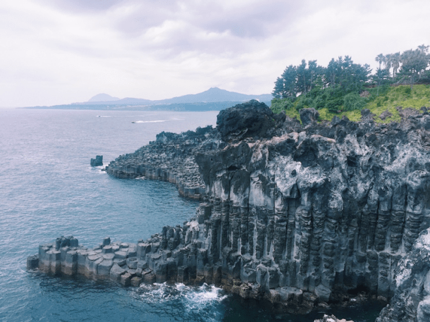 Jusangjeolli, officially known as the Daepo Jusangjeolli Cliff (주상절리(대포동지삿개)) is a renowned cultural monument of Jeju-do. The Jusangjeolli Cliff was formed when the lava from Hallasan Mountain erupted into the sea of Jungmun. It is best known for its distinct hexagon shaped rock pillars of various sizes that look as if they were carved out.