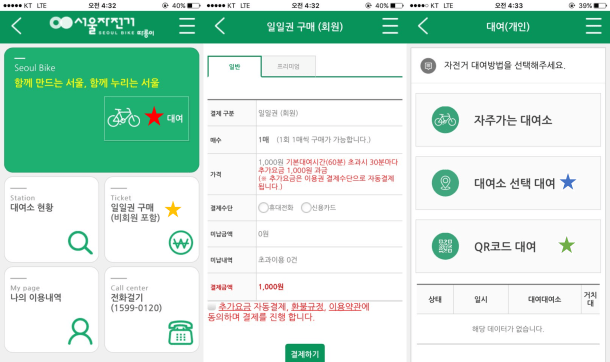 After you log-in, you have to buy your one-day ticket for the bicycle. Click on the yellow star, 일일권 구매 which means ‘one-day ticket’. Then the second monitor comes out and you can buy the ticket for 1,000 Won. It is a 60min ticket. After the 60 minutes are up, then the price is 1,000won per 30min. You can choose the method of pay(결제수단) by 휴대전화(cell-phone) or 신용카드(credit card). Check the box below to agree to payment and then click the green box below to buy. After you buy the ticket, you can go to 대여(borrow) which I marked with the red star. Here you can pick where you are borrowing by choosing the place (Blue star. 대여소 선택 대여) or by scanning the QR code at the bicycle stop (Green star. QR코드 대여). After picking the stop and bicycle by number, the bicycle is yours to ride!