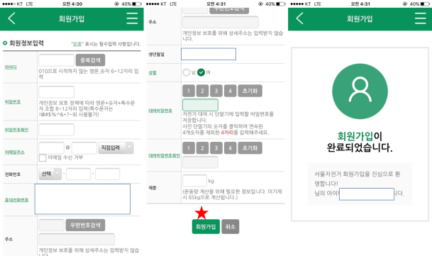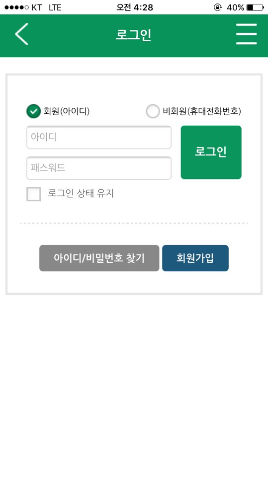 This is the first page you will see when downloading the app. You must click on 로그인(회원가입) for logging in (Signing up).