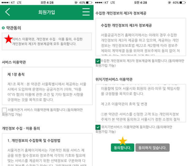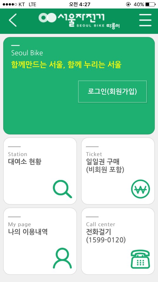 Next is where you should put your 아이디(ID), 비밀번호(password), 비밀번호 확인(password again), 이메일 주소(e-mail), 휴대전화번호(cell-phone number. The top is the telecom and the bottom are the numbers), 남/여 (Male/Female), 대여비밀번호(the password for your borrowing a bicycle). I only told you the things in green because those are the ‘must needed’ information. Then click the red star(회원가입. Sign up). You are now signed in!