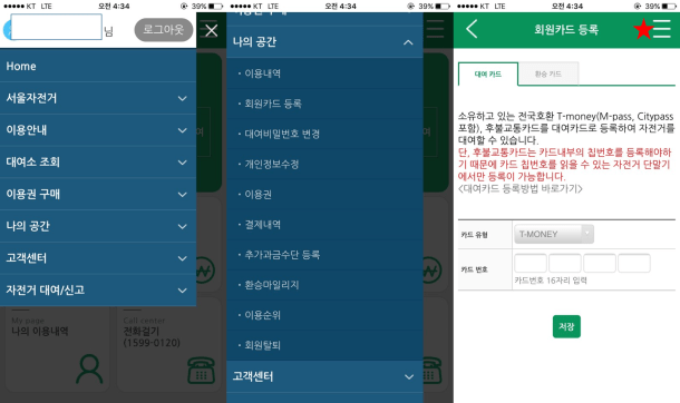 Here is a picture of how to get to Card Registration. First you click the three line shaped button (the red star). Then you go to 나의공간(my space) and 회원카드 등록(card registration. It is the second menu). Here you can register your T-Money or any public transportation card.
