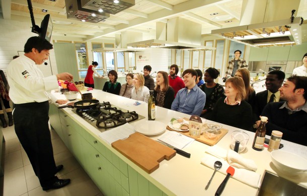A shot of the kitchen studio being used for a foreigner-focused cooking class (Source: https://kdtokimchi.com/2013/02/04/sundays-in-seoul-free-cooking-class-at-cj-food-world/)