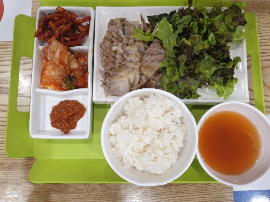 Next is Bossam. Bossam is a very popular food among Korean people. Especially with the food delivery service, Bossam has become top 3 food for delivery including fried chicken and Chinese food. Bossam is usually a meal with pork that is boiled with spices and that is thinly sliced. It is also served with kimchi, raw garlic, lettuce, salted shrimp, etc. The food court at Hanyang Plaza is great place to try Bossam. The combination of spiced lettuce and pork is very good. Side dishes such as kimchi suits the harmony of Bossam.