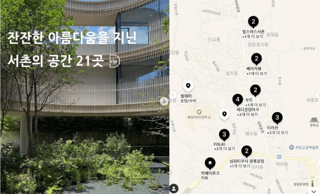 The second is probably my favorite page out of the three. The page’s name is daytrip_korea. You and I probably wonder where I should go with my friend and do something exciting. This app organizes a post for a day trip to somewhere. It has all kinds of locations from just a small area in Seoul to an area outside of Seoul. For example, a day trip they selected was Seocheon. They make their post by selecting some places to eat and places to visit in that area such as showrooms and artistic places. The images are of people called day trippers who take pictures of these places and those images are used in the post. Similarly to the first page, they have their own app which shows all the places the page has selected for you to visit.