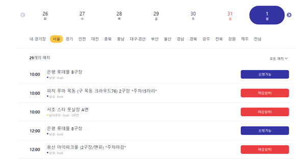 First of all, go to a website ‘www.plabfootball.com’. To use the service, you need your own ID. Making an ID requires a valid email address or you can simply use your Kakao ID if you already have one. After that, you can see all matches currently available with their location, time, and the number of people available. As you can see on the picture above, there are 29 matches available in Seoul on November 1st. You can check whether the match will be soon closed or not. Sometimes, there are matches with three teams so you can also check that.