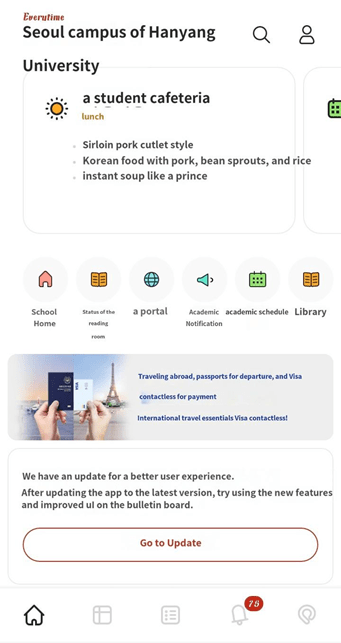 As, now, you can see there are a lot of things you can access with this app such as the school portal, the library, your schedule for classes, etc. So, you can access the cafeteria menu through this app and see if there is something in any of the cafeterias in Hanyang that has something you like. Moreover, you can add friends here and then share your schedule with them. You can update your schedule every semester in this app and that will help people like me who are lazy to remember the classroom number, floor, etc.