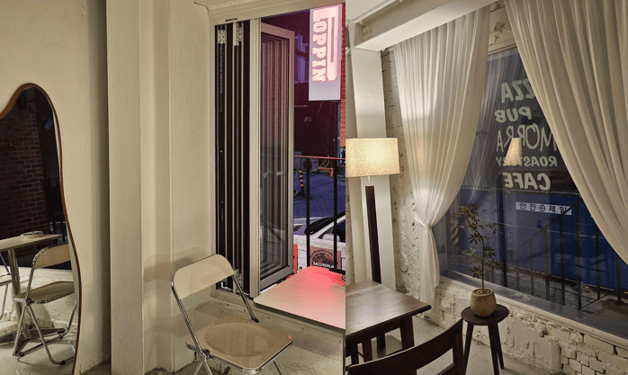 This is the place. This is how it looks. I went there a little early but did not take a picture at that time, and when I came out, it was dark. We ordered a pizza and pasta, and our bill was around 35,000 won. The pizza was huge, so I think you will be full. The time we went was a weekday, so not many people were there, and the shop had a big window open.